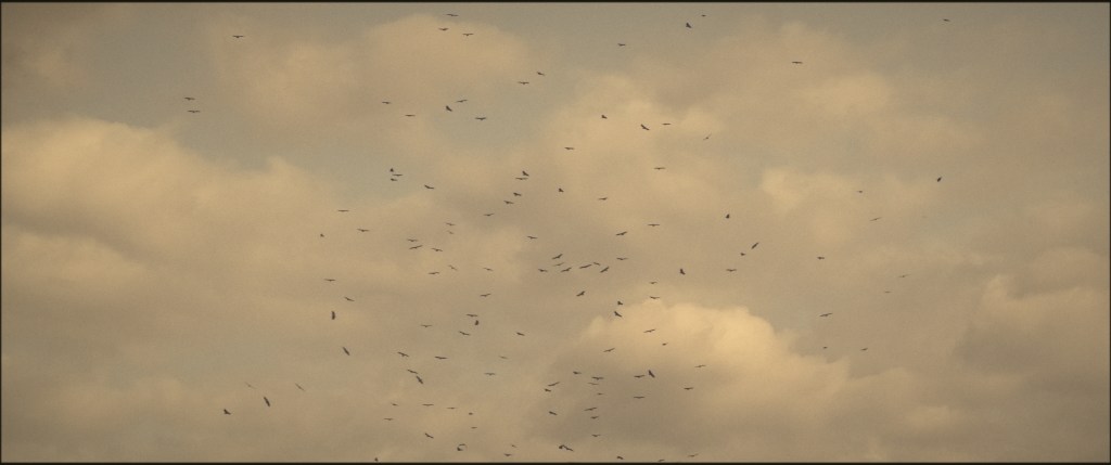 d’oiseaux, en ombres, se mettent à tournoyer et descendent vers une place, où
